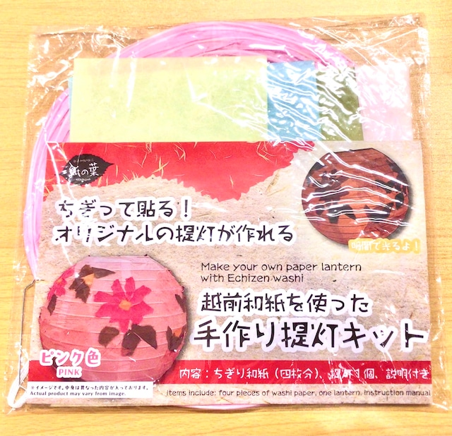 ちぎり和紙でオリジナルの提灯が作れるキット!ちぎり用和紙と説明書も付いてきます。 提灯のサイズ:25cm 内容: 無地提灯 1個入り (色選択) 提灯用のライト 1個 ちぎり用和紙 4枚入り (約A5サイズ) 作り方説明書 Make you own Japanese Lantern with Echizen Washi paper! Tear and create art with washi paper and decorate your home or gift it to a loved one. Lantern Size: 25cm This kit includes: One lantern with light included 4 different colors of A5 washi paper Instruction manual in English as well