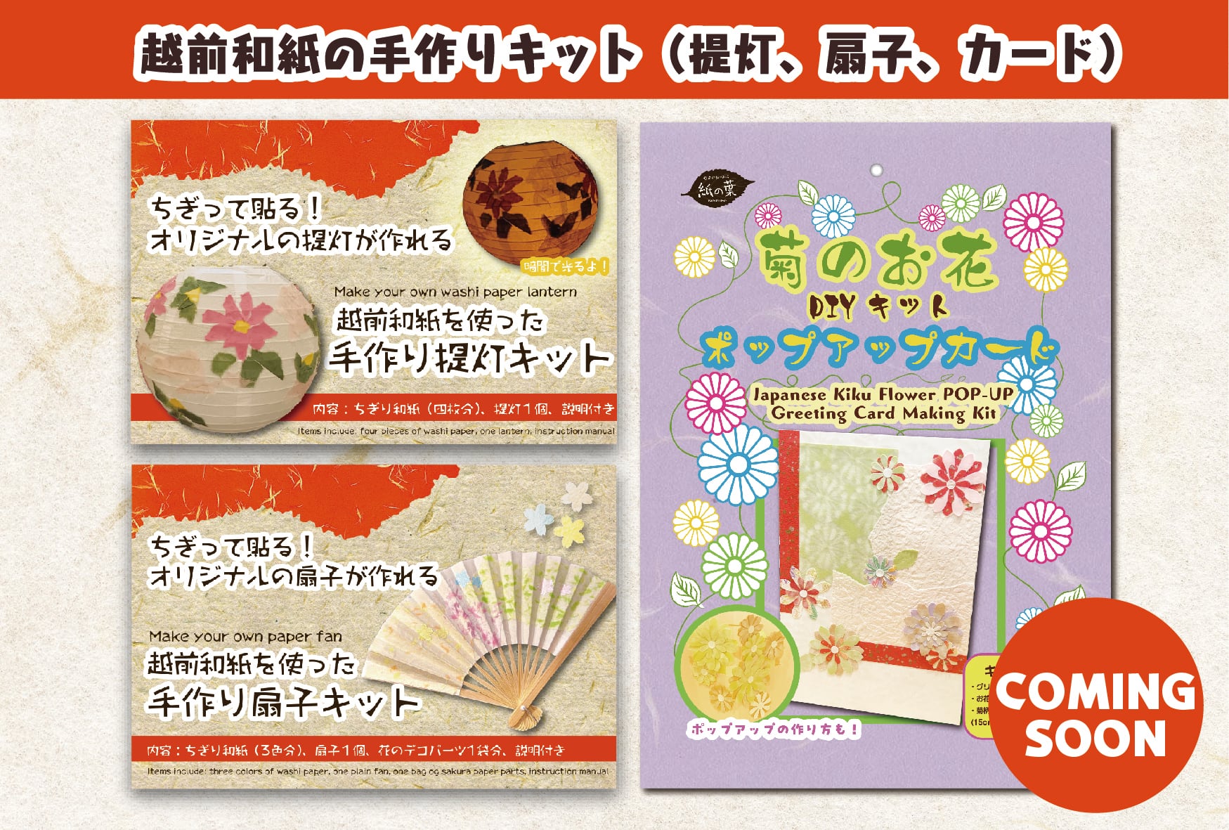 オリジナルのポップアップグリーティングカードが作れるキット!越前和紙の折り紙、デコパーツと説明書も付いてきます。パッケージも越前和紙を使用しています、作り終わった後も材料を袋に入れて保存いただけます。 内容: 無地のグリーティングカード 1枚 お花のデコ和紙パーツ 1袋分 菊柄の折り紙10cm角サイズ 7色分 説明書 Make you own pop-up greeting card with Echizen Washi paper! Tear and create art with washi paper and decorate your card with pretty flowers! Great to decorate your home or gift it to a loved one. This kit includes: One plain greeting card 7 different colors of flower print washi paper One bag of washi paper parts for decoration Instruction manual in English