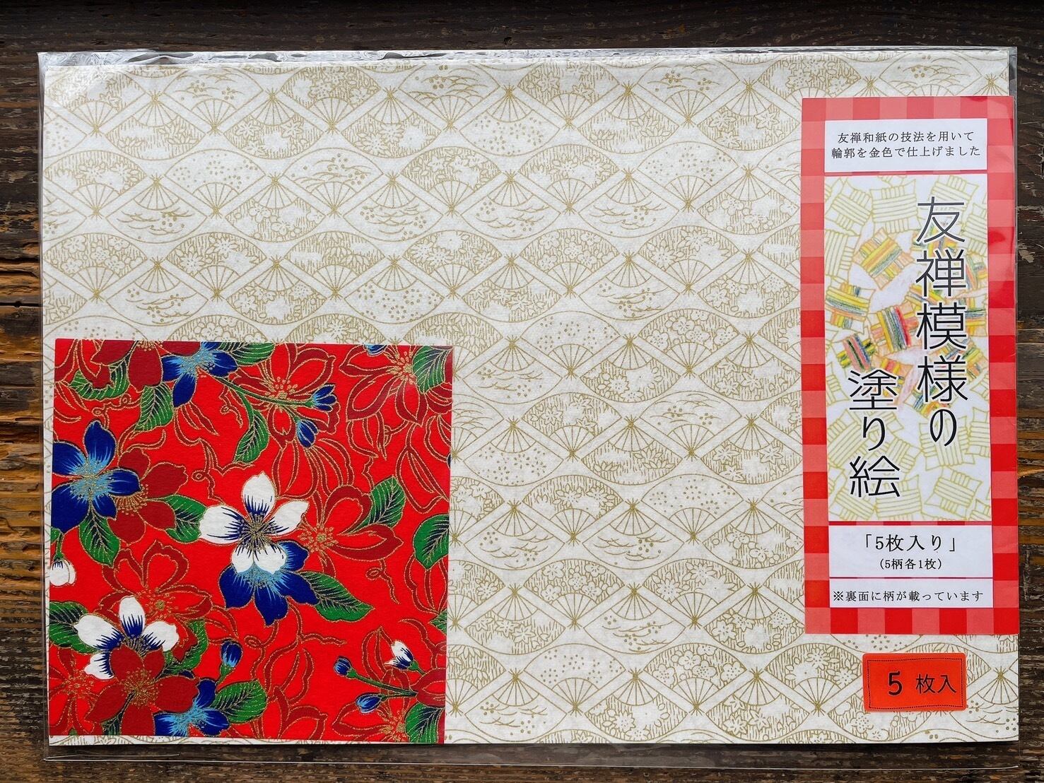 Yuzen washi paper coloring sheets. There are 5 coloring sheets inside with 5 different Yuzen patterns, along with one piece of 15cm square Yuzen Washi origami paper.