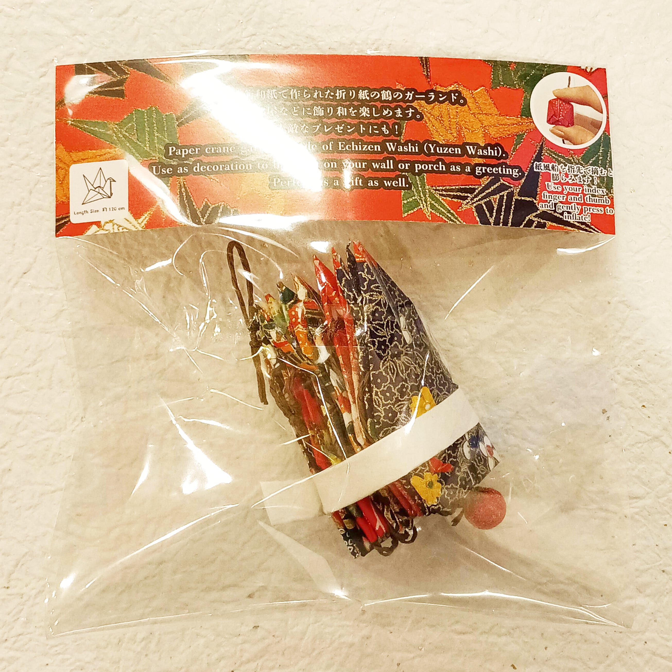壁などに飾る友禅和紙の折り紙鶴のガーランド。折りたたまれている為、お使いいただくときはやさしく紙を開いてください。風船は上下を指で摘むことで膨らみます。