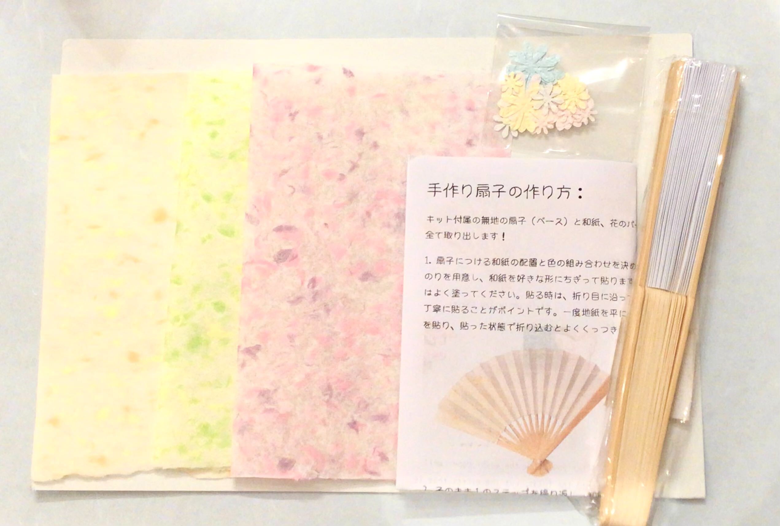 ちぎり和紙でオリジナルの扇子が作れるキット!デコパーツと説明書も付いてきます。